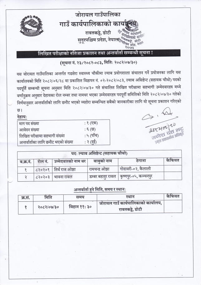 लिखित परीक्षाको नतिजा प्रकाशन तथा अन्तर्वार्ता सम्बन्धी सूचना !