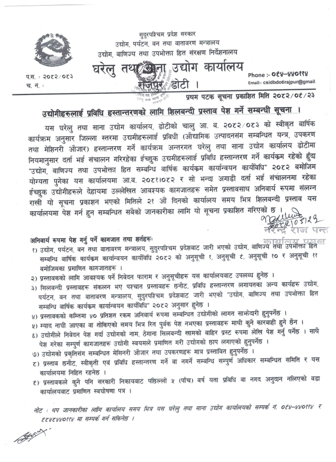 उद्योगीहरुलाई प्रविधि हस्तान्तरणको लागि शिलबन्दी पेश गर्ने सम्बन्धी सूचना