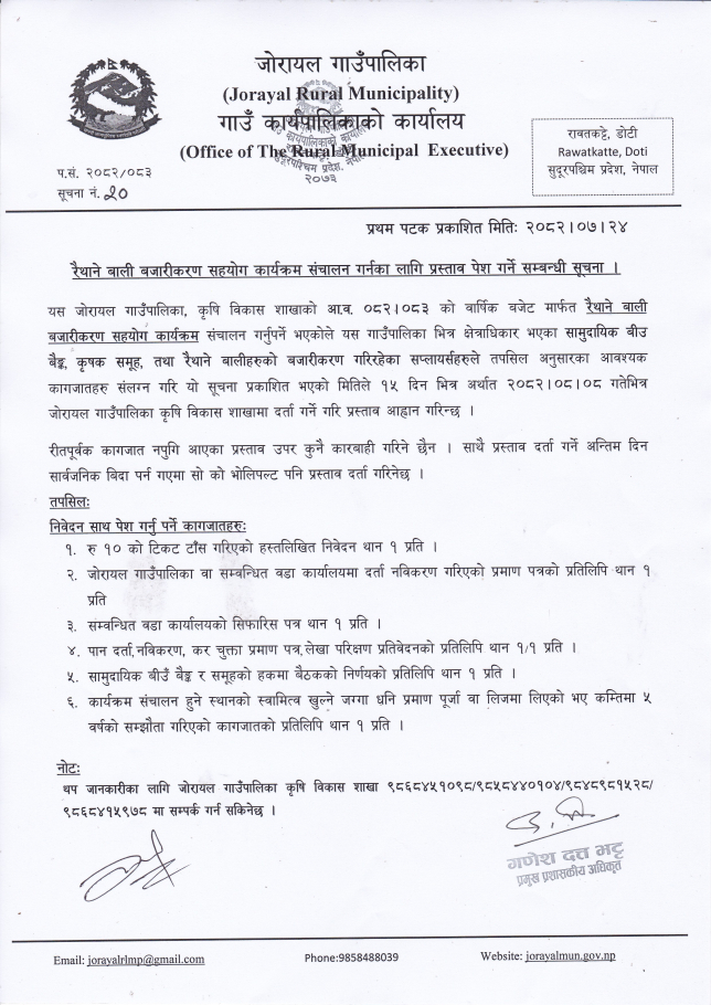 रैथाने बाली बजारीकरण सहयोग कार्यक्रम संचालन गर्नका लागि प्रस्ताव पेश गर्ने सम्बन्धी सूचना !