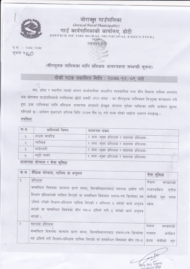 सिपमुलक तालिमका लागि प्रशिक्षक आवश्यकता सम्बन्धी सूचना !(दोस्रो पटक प्रकाशित)