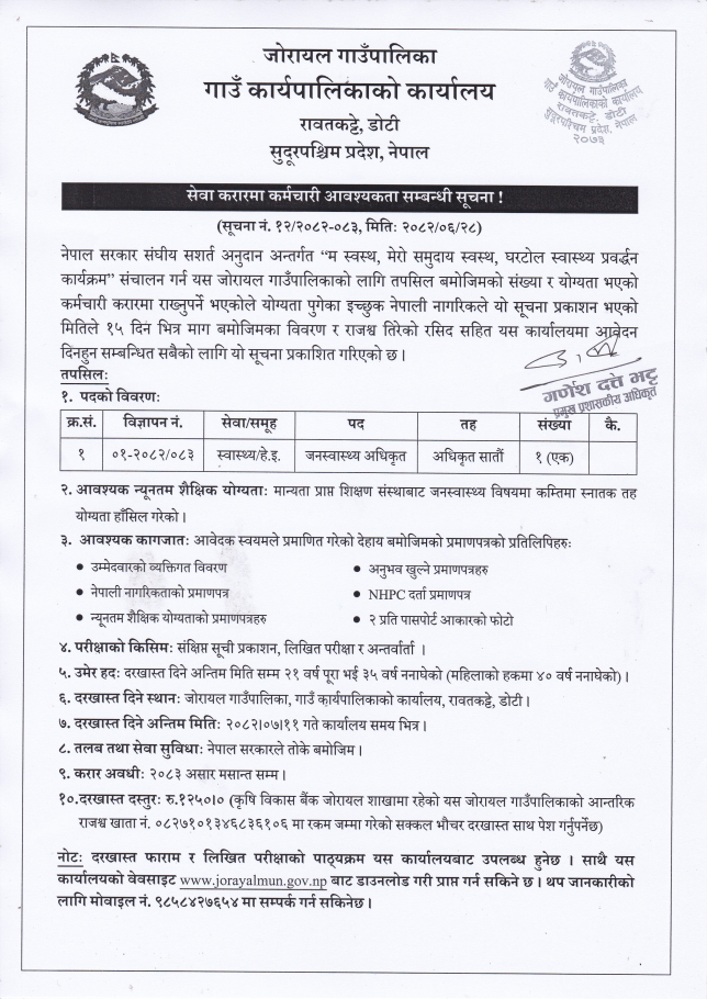 सेवा करारमा कर्मचारीआवश्यकता सम्बन्धी सूचना (जनस्वास्थ्य अधिकृत) !