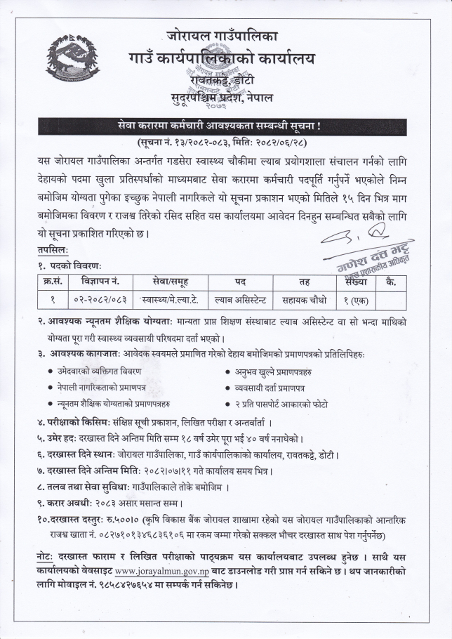 सेवा करारमा कर्मचारी आवश्यकता सम्बन्धी सूचना (ल्याब असिस्टेन्ट) !