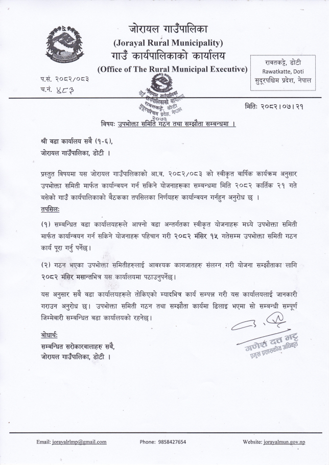 उपभोक्ता समिति गठन तथा सम्झौता सम्बन्धमा ।
